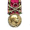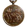 Ovale Medaille aus vergoldetem Messing. Oben am Rand ein fliegendes Band nach rechts und links. Mittig zu einem Dreieck geformt in das die durchbrochene, bewegliche Krone eingehängt ist. Durch den Reichsapfel der Krone geht der Bandring.