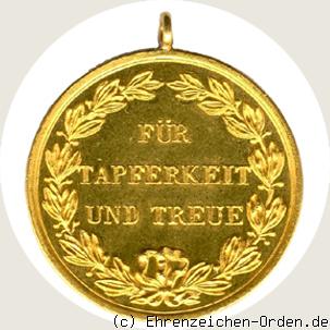 Die goldenen Medaillen wurden mit gewöhnlicher Öse angefertigt. Da der Mangel an Edelmetallen im Weltkrieg immer größer wurde sind die letzten Stücke mit geringerem Goldgehalt angefertigt worden. Der Goldgehalt betrug bis dahin noch 14 Karat und wurde im Krieg auf 8 Karat heruntergesetzt. Verliehen wurde diese Medaille für große Tapferkeit. So konnten Manschaftsdienstgrade diese Auszeichnung nur erhalten wenn sie vorher bereits das Eiserne Kreuz 1.Klasse erhalten hatten. Der goldenen Militär-Verdienst-Medaille wurde später die Stellung vor dem Ritterkreuz 2.Klasse mit Schwertern des Friedrichsordens zuerkannt. Die Verleihungszahl liegt bei ca. 4200 in den verschiedenen Goldgehalten. Vergoldete Medaillen wurden nur als private Nachprägungen gefertigt. Quelle: J. Nimmergut, Deutsche Orden und Ehrenzeichen bis 1945, Bd. IV, 2001.