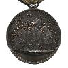Versilbertes, kupfernes Kreuz mit roter Glasemaille auf der Vorderseite der Kreuzarme und ein rundes Mittelschild. Oben eine Öse mit kleinem Ring und Bandring.