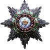 Achtstrahliger, brilliantierter Bruststern aus Silber. Mittig aufgelegt ein goldenes, emailliertes Ordenskreuz mit rundem Medaillon. Die Rückseite mit senkrechter Anstecknadel mit Gegenhaken. Das Kreuz aufgeklammert. Mittig eine verzierte Abdeckplatte mit der Herstellerbezeichnung.