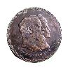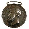 Ovale, durchbrochene Medaille aus Silber mit breitem Schriftring. Die Schrift und die erhöhten Ränder sind poliert. Oben eine angelötete, parallele, gewöhnliche Öse. In diese mit einem kleinen Ring eingehängte, gekreuzte, vergoldete Schwerter. Mittig oben auf den Schwertern eine weitere Öse mit Bandring.