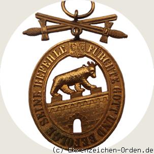 Ovale, durchbrochene Medaille aus vergoldeter Bronze mit breiter Umrandung. Die Schrift und die erhöhten Ränder sind poliert. Oben eine angelötete gewöhnliche Öse. In diese mit einem kleinen Ring eingehängte, gekreuzte, goldene Schwerter. Mittig oben auf den Schwertern eine weitere Öse mit Bandring.