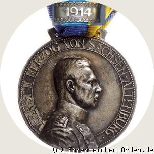 Der Stempel stammt bei beiden Medaillen von Max Haseroth. Für Kriegsverdienst wurden 2 gekreuzte Schwerter auf dem Band getragen. Ab dem 31.08.1915 wurde zur Medaille eine Bandschlaufe mit der Jahreszahl – 1914 – verliehen. Diese wurde an Personen verliehen die sich auf dem Gebiet der Wohlfahrt und Krankenpflege im Krieg verdient gemacht haben. Für besonders hervorragende Verdienste wurde die Medaille mit silberner Krone verliehen. Das Gefolge des Herzogs im Krieg bekam eine Bandauflage aus 3 Eichenblättern mit den Jahreszahlen – 1914/15. Folgende Kombinationen sind möglich: Bandschlaufe mit und ohne Krone, Schwerter mit und ohne Krone sowie Eichenlaub mit und ohne Krone. Quelle: Ehrenzeichen des Herzogtums Sachsen-Altenburg…, Katalog zur Ausstellung 2003, Schloss-und Spielkartenmuseum Altenburg.