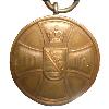 Runde Medaille aus Silber. Oben eine breite, quer verlaufende Öse. Das Band ist durch die Öse und durch die Bandschlaufe gezogen.
