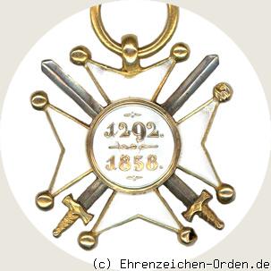 Goldenes Kreuz in Malteserform. Die weiß emaillierten Kreuzarme mit kleine goldene Kugeln an den Kreuzspitzen. Vorder-und Rückseite mit aufgelegtem runden Medaillon. Durch die Mitte gekreuzt 2 Schwerter, die Griffe gold und die Klingen silbern. Zwischen den Spitzen des oberen Kreuzarmes eine kuglige Öse mit Bandring.
