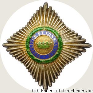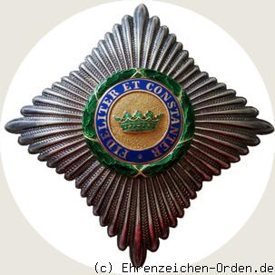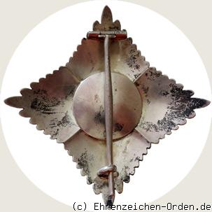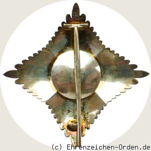 Vierstrahliger Ordensstern aus Silber. Zwischen den 4 Hauptstrahlen jeweils 13 zur Mitte leicht abgestufte Zwischenstrahlen. Die Einzelstrahlen jeweils seitlich mit einer schnurähnlichen Einfassung. Mittig aufgelegt ein rundes, goldenes und emailliertes Medaillon. Die Rückseite ist glatt und silbern. Senkrecht eine Anstecknadel mit Gegenhaken.