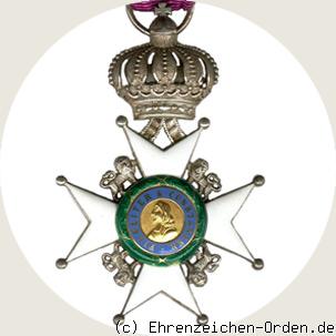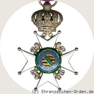 Silbernes Kreuz in Malteserform mit kleinen Kugeln an den 8 Spitzen. Die Kreuzarme sind weiß emailliert. Forder- und Rückseite mit aufgelegtem runden goldenem Medaillon. Zwischen den Kreuzarmen je ein nach oben bzw. nach unten schreitender Löwe. Am oberen Kreuzarm zwischen den Spitzen eine Halterung für die oben angebrachte herzogliche Krone. Durch den Reichsapfel geht der Bandring.