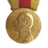 Ovale Medaille aus vergoldetem Messing. Oben am Rand ein fliegendes Band nach rechts und links. Mittig zu einem Dreieck geformt in das die durchbrochene, bewegliche Krone eingehängt ist. Durch den Reichsapfel der Krone geht der Bandring.