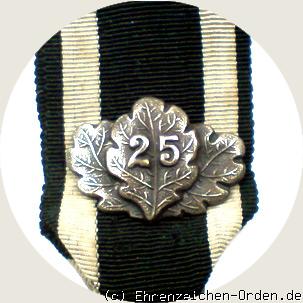 Kaiser und König Wilhelm II. stiftete am 18. August 1895 das, von ihm entworfene, Eichenlaub mit der Zahl 25. Anlass war die 25-jährige Wiederkehr Siegestage des Krieges von 1870/71. Der Kaiser wollte allen noch lebenden Inhabern des Eisernen Kreuzes 2. Klasse mit einer besonderen Auszeichnung nochmals ehren. Das Stiftungsdatum 18. August sollte an die Schlach bei Gravelotte-St. Privat erinnern. Träger des Eisernen Kreuzes 1. Klasse wurden nicht berücksichtigt. Das Eichenlaub sollte laut Anordnung möglichst dicht am Eisernen Kreuz angebracht werden. Veröffentlicht wurde die Stiftung am 19. August 1895 im Reichs- und Staatsanzeiger. Die erste Verleihung erfolgte am 26. August 1895 anlässlich einer Parade ehemaliger Kriegsteilnehmer in Berlin auf dem Tempelhofer Feld durch Wilhelm II. Diverse Händler haben bereits eigenmächtig im Vorfeld unterschiedliche nicht vorschriftsmäßige Muster in Umlauf gebracht. Deshalb wurde am 29. August in entsprechenden Publikationen wie dem Armee-Verordnungsblatt darauf hingewiesen nur Eichenlaub in Form der offiziellen Probe herauszugeben. Das offiziell genehmigte Muster war eine Auflage in Gestalt von 3 silbernen, gewölbten und hohl geprägtem Eichenlaubblättern. Auf dem mittleren Blatt die erhöhte Zahl 25. Trotzdem gibt es eine Vielzahl von Eichenlaubspangen die geringfügig in der Gestaltung abweichen. Grund dafür sind die vielen Hersteller die die Nachfrage befriedigten. Die Träger mussten das Eichenlaub selbst beschaffen und bezahlen. Neben Exemplaren aus Silber kommen auch versilberte Auflagen aus Weißmetall und Kupferlegierungen vor. Das erschwert die Bestimmung von zeitgenössischen Originalen. Quelle: Frank Wernitz, Das Eiserne Kreuz 1813-1870-1914, 2013.