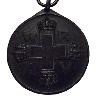Kreuz aus vergoldeter Bronze. Die Kreuzarme mit erhöhten Rändern sind innen fein gekörnt. In den Kreuzarmen im Abstand innen ein goldener, erhöhter, dünner Rand. Vorder-und Rückseite mit aufgelegtem runden Medaillon. Oben eine angelötete Öse mit Bandring.