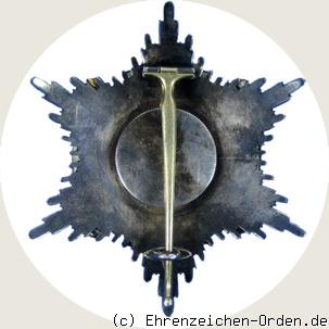 Aufgelegt auf einem 6-strahligen silbernen Stern ein vergoldetes Kreuz mit abgerundeten Kreuzarmenden. Die Kreuzarme sind weiß emailliert mit einem im Abstand innen liegenden schwarzem Rand. Mittig ein aufgelegtes rundes Medaillon. Zwischen den Kreuzarmen mit Abstand ein grün emaillierter Kranz, links aus Lorbeer rechts aus Eichenlaub. Dieser wird überlagert durch 2 durch die Mitte gehende vergoldete Schwerter. Die Rückseite glatt mit senkrechter Anstecknadel.