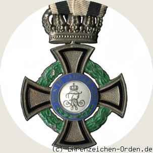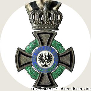 Silbernes Kreuz mit abgerundeten Kreuzarmenden. Die Kreuzarme sind fein gekörnt mit einem im Abstand innen liegenden schwarzem Rand. Mittig auf Vorder- und Rückseite ein aufgelegtes rundes Medaillon. Zwischen den Kreuzarmen mit Abstand ein grün emaillierter Kranz, links aus Lorbeer rechts aus Eichenlaub. Am oberen Kreuzarm eine beweglich angefügte silberne, preußische Königskrone auf dessen Rückseite eine breite quer liegende Öse für das Band angebracht ist.