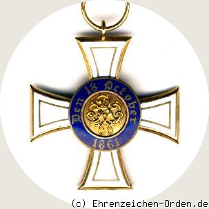 Goldes Kreuz mit weiß emaillierten Kreuzarmen. In den Kreuzarmen im Abstand innen ein goldener dünner Rand. Vorder-und Rückseite mit aufgelegtem runden Medaillon. Oben eine angelötete Öse mit Bandring.