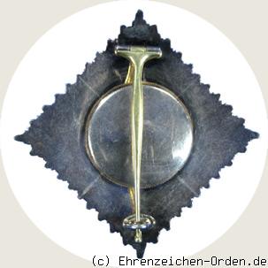 Silberner 4-straliger Stern. Dazwischen gleichmäßig in einer Linie abgestuft 9 weitere Strahlen. Zwischen allen Strahlen jeweils dünnere, verkürzte Zwischenstrahlen. Mittig aufgelegt ein rundes, goldenes Medaillon. Die Rückseite ist glatt, silbern mit gewölbter, runder Abdeckplatte und senkrechter Anstecknadel.