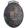 Runde Medaille aus Bronze mit erhöhtem Rand. Oben eine angelötete, gewöhnliche, etwas stärkere Öse mit Bandring.