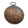 Kreuz aus vergoldeter Bronze mit glattem Rand. Die Innenseiten der Kreuzarme sind gekörnt. Am oberen Kreuzarm eine Kugelöse mit Bandring.