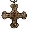 Achtspitziges Kreuz aus Silber in Malteserform. Die Kreuzarme sind poliert und haben einen kleinen erhöhten Rand. Vorder- und Rückseite mit aufgelegtem runden Mittelschild ( 16 mm ). Zwischen den Spitzen des oberen Kreuzarmes eine angelötete gewöhnliche Öse mit Bandring.