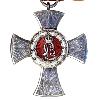 Achtspitziges Kreuz aus Silber. Die Kreuzarme mit kleinen Kugeln an den Spitzen haben erhöhte, glatte Ränder. Die Innenseiten sind gekörnt. Zwischen den Spitzen des oberen Kreuzarms eine Agraffe mit der die fünfbüglige, durchbrochene Krone beweglich verbunden ist. Zwischen den Kreuzarmen jeweils ein verzierter Buchstabe – L -. Vorder- und Rückseite mit runden Mittelschildern. Die Rückseite mit senkrechter Anstecknadel mit Gegenhaken.