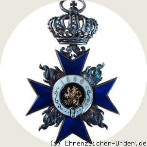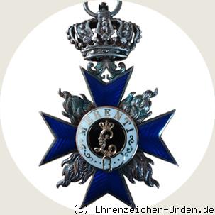 Achtspitziges Kreuz aus Silber. Die Kreuzarme sind silbern bordiert und blau glasemailliert. Durch die Emaille ist eine fischgrätenähnliche Schraffur zu sehen. Vorder und Rückseite mit goldenem Mittelschild. Zwischen den Kreuzarmen silberne Flammen. Zwischen den Spitzen des oberen Kreuzarmes eine Agraffe mit der die silberne Krone beweglich verbunden ist. Durch den Reichsapfel der Krone geht der Bandring. Im Bandring der Hersteller -GH-.