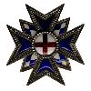Achtspitziges Kreuz aus Gold. Der untere Kreuzarm ca. doppelt so lang und breiter auslaufend. Die Kreuzarme sind golden bordiert und mit durchscheinender, blauer Emaille. Die Vorderseite mit aufgelegtem, runden Mittelmedaillon. Zwischen den Kreuzarmen goldene Flammen. Auf dem oberen Kreuzarm aufgenietet 2 gekreuzte, gebundene goldene Schwerter. Oben eine fest verbundene, hohl gefertigte, offene, 5-büglige, goldene Krone. Die Rückseite mit senkrechter Anstecknadel mit Gegenhaken.