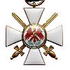 Achtspitziges Kreuz aus Silber. Die Kreuzarme sind gekörnt und von polierten Kanten eingefasst. Vorder-und Rückseite mit rundem, aufgelegtem und 3-teiligem Mittelschild. Das Medaillon der Vorderseite ist aus Gold und emailliert. Zwischen den Spitzen des oberen Kreuzarmes eine mitgeprägte Agraffe mit querstehender Öse durch die der Bandring geht. Die Herstellerbezeichnung befindet sich auf der Rückseite der Agraffe. Der Bandring ist mit der Silberpunze 900 versehen.