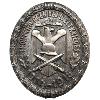 Spitzer Ordensschild überhöht von einer mit Bändern gehaltenen, silbernen Kaiserkrone unter einer 25. Der Schild ist auf der Vorderseite silbern bordiert und diagonal weiß – rot emailliert. Die Rückseite ist glatt silbern mit senkrechter Anstecknadel. Unten die Herstellerbezeichnung.