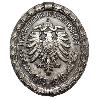 Hohl geprägtes, ovales Abzeichen aus versilbertem Buntmetall. Die Vorderseite ist teilweise emailliert und vergoldet. Hinten eine angelötete senkrechte Anstecknadel.