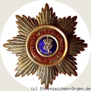 Großherzog Paul Friedrich August stiftete den Haus-und Verdienstorden am 27.November 1838. Er sollte an die 25 jährige Wiederkehr seines Vaters erinnern. Die Devise des Ordens ist: Ein Gott ein Recht eine Wahrheit. Der Orden bestand aus 4 Klassen für Ehrenritter und 4 Klassen für Kapitulare: Großkreuz, Großkomtur, Komtur und Kleinkreuze (ab 1860 Ritterkreuze). Angeschlossen an den Orden war das Allgemeine Ehrenzeichen in 3 Klassen: Gold, Silber und Eisen. Die Großkreuze wurden 1841 unterteilt in Kreuze mit goldener und silberner Krone. Die Bruststerne für Großkreuze und Großkomture waren von der Gestaltung her gleich. Zu erkennen war die Stufe an der Trageweise. Großkreuze Stern auf der linken und Großkomture auf der rechten Seite. Die Größe schwankt zwischen 80 und 87 mm. Ob das mit den Klassen, den Herstellern oder der Verleihungszeit zusammenhängt ist nicht bewiesen. Insgesamt wurden zusammen 887 Großkreuze und Großkomture verliehen. Hersteller der Bruststerne waren Carl Zell Hannover (1839), Juwelier Wohack in Frankfurt, Bernhard Dietrich in Altenburg und vor allem Knauer und Lameyer in Hannover. Die Firma Knauer, unter verschiedenen Nachfolgern, lieferte bis Ende des 1. Weltkrieges. Die Herstellerbezeichnung befindet sich meist auf der Rückseite der Nadel z.B. LAMEYER, KNAUER auch mit Halbmond und Krone. 1856 wurde diese Auszeichnung für Verdienste im Kriege durch 2 Schwerter erweitert, die durch die Mitte gingen. Bei einer höheren Verleihung im Frieden wurden diese am Ring hinzugefügt. Zum Allgemeinen Ehrenzeichen 1. Klasse wurde eine goldene Krone gestiftet. 1883 wurde das Allgemeine Ehrenzeichen in Ehrenkreuz umbenannt. Im Jahre 1903 wurde das Offizierskreuz gestiftet das zwischen Komtur und Ritterkreuz 1. Klasse steht. Die Ritterkreuze 2. Klasse wurden 1906 unterteilt. Es konnten jetzt Ritterkreuze 2. Klasse ohne Krone verliehen werden. Die letzte Erweiterung war die Stiftung des Lorbeers für Kreuze mit Schwertern 1918. Die Verleihungszahl für das Grosskreuz mit Goldener Krone ist 277 und für den Grosskomtur 610 Verleihungen. Damit ergeben sich insgesamt 887 Bruststerne. (Quelle: F. Beyreiss, Der Hausorden und die tragbaren Ehrenzeichen des Grossherzogtums Oldenburg 1813 – 1918)