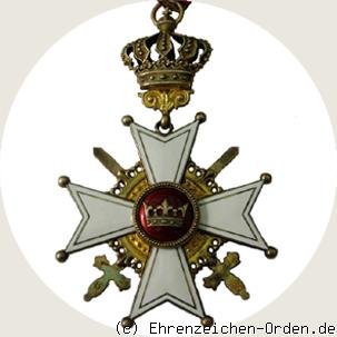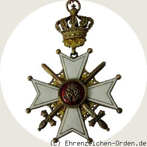 Achtspitziges Kreuz aus Gold. Die Kreuzarme sind gold bordiert und weiß emailliert mit kleinen goldenen Kugeln an den Kreuzarmspitzen. Innenliegend in kleinem Abstand vom Rand eine goldene Linie. Zwischen den Kreuzarmen je eine goldene, durchbrochene Herzogskrone. Vorder- und Rückseite mit aufgelegtem goldenem Medaillon. Durch die Mitte gehen 2 gekreuzte, goldene Schwerter mit Parierstangen in floraler Gestaltung. Diese überlagern auf der Vorderseite die Herzogskronen. Zwischen den Spitzen des oberen Kreuzarms eine parallele Öse. In diese eingehängt eine Agraffe mit Ring auf der eine 5-büglige, offene Krone sitzt. Durch den Reichsapfel der Krone geht ein Ring mit länglichem, doppeltem Bandring.