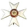 Achtspitziges Kreuz aus Gold. Die Kreuzarme golden bordiert und weiß emailliert. Vorder- und Rückseite mit aufgelegtem, rundem Medaillon. An den Spitzen der oberen Kreuzarme 2 angelötete, kleine Ösen. In diese eingehängt zwei gekreuzte, goldene, antike Schwerter. Im oberen Winkel der gekreuzten Schwerter eine Öse in die der längliche Bandring geht.