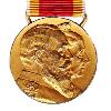 Runde Medaille mit erhöhtem Rand aus Goldbronze (hier vergoldetes Silber). Oben eine angelötete gewöhnliche Öse mit Bandring.