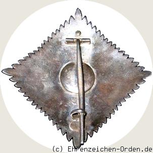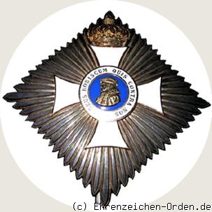 Großer 4-strahliger Stern aus Silber. Die 4 Strahlen oben und seitlich sind am längsten. Zwischen den Strahlen jeweils 14 kleinere Strahlen die die Eckstrahlen gleichmäßig verbinden. In der Mitte aufgelegt das weiß emaillierte Kreuz des Ordens. Oben auf dem Kreuz aufgesetzt eine goldene Krone (19 x 20 mm). Hinten eine senkrechte Anstecknadel.