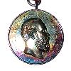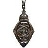 Runde Medaille aus Silber mit Rand. Oben eine angelötete gewöhnliche Öse mit Bandring an Damenschleife.