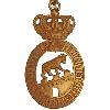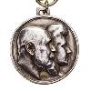 Runde Medaille aus Silber mit erhöhtem Rand. Oben eine angelötete derbere Öse mit Bandring.