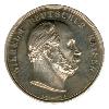 Runde Medaille aus Silber oben eine angelötete offene Königskrone. Durch den Reichsapfel der Königskrone geht der Bandring.