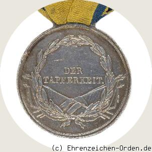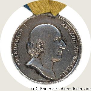 Gestiftet wurde die Tapferkeitsmedaille am 19. März 1807 durch Herzog Friedrich I. August von Nassau-Usingen und am 9. August 1807 durch Herzog Friedrich Wilhelm von Nassau-Weilburg durch Übernahme der Statuten in Gold und Silber. Die Medaille sollte als äußeres Zeichen dienen um einzelne Tapferkeitstaten im Militär nicht in Vergessenheit geraten zu lassen und den Nachkommen Ansporn zu geben. Verliehen wurde die Medaille an Angehörige des nassauischen Militärs ohne einen bestimmten Rang als Voraussetzung für tapfere Handlungen. Die Verleihung an Ausländer war ebenfalls möglich. Mit der Verleihung war ein Ehrensold für die Dauer des aktiven Dienstes verbunden. Für die silberne Medaille wurde die Hälfte des Soldes und für die goldene Medaille der ganze Sold als Zulage gezahlt. Die Medaillen waren nicht rückgabepflichtig. Es war möglich dass 1 Person beide Medaillen erhalten hat. Stempelschneider war Johann Lindenschmit aus Mainz. Die Medaillen wurden 1807 für die Belagerung von Colberg , für die Feldzüge 1808 bis 1813 (Österreich und Spanien) und 1815 für die Schlacht bei Waterloo verliehen. Die Verleihungszahl bei der silbernen Medaille liegt bei 246 Stück. Quelle: J. Nimmergut, Deutsche Orden und Ehrenzeichen bis 1945, Bd. II , 1997.
