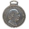 Runde Medaille aus Silber mit erhöhtem, schmalen Rand. Oben eine mitgeprägte breite Bügelöse durch die das Band gezogen wurde.