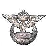 Runde Medaille aus mattem Silber mit flachem Rand. Oben eine angelötetes, dreieckiges Element mit Loch. Durch das Loch geht ein länglicher, nach oben breiter werdender Bandring.