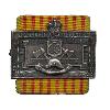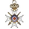 Silbernes, achtspitziges Kreuz. An den Spitzen der Kreuzarme kleine Kugeln. Die Kreuzarme mit polierten, glatten, erhöhten Rändern. Die Innenseiten sind fein gekörnt. Vorder- und Rückseite mit mitgeprägtem Mittelschild (21 mm). Zwischen den Spitzen des oberen Kreuzarmes eine fächerförmige Verzierung mit kugeliger Öse und Bandring.