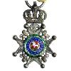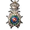 Achtspitziges Kreuz aus Gold. Die Spitzen der Kreuzarme sind mit kleinen Kugeln versehen. Die Kreuzarme sind golden bordiert und innen dunkelblau emailliert. Vorder- und Rückseite mit aufgelegten, runden Medaillons. Zwischen den Kreuzarmen jeweils ein goldener Löwe mit erhobener Tatze. Die 2 oberen nach oben gewandt, die unteren nach unten gewandt. Auf den Spitzen des oberen Kreuzarms eine starr verbundene, offene, fünfbüglige, goldene Königskrone. Durch den Reichsapfel der Krone geht der Bandring.