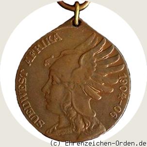 Die Denkmünze diente der Anerkennung von hervorragenden Leistungen, Tapferkeit, Anstrengungen und Entbehrungen der deutschen Streitkräfte bei der Niederschlagung der Aufstände in Südwest-Afrika. Maßgebend war der Zeitraum von Januar 1904 bis 31. März 1907. Verliehen wurde diese an Kämpfer in Bronze und an Nichtkämpfer in Stahl. Diese Medaille für Kämpfer wurde an alle Offiziere, Soldaten, Marineingenieure, Beamte, Zeug- und Feuerwerksoffiziere verliehen, die nach Südwest-Afrika entsendet wurden oder beim Beginn der Kämpfe bereits dort stationiert waren. Weiterhin wurden andere Personen ausgezeichnet die mit der Waffe die Niederschlagung unterstützten, auch Ausländer einschließlich der Buren, und Mitglieder der freiwilligen Krankenpflege in der Zeit. Beamte der Feld-Postanstalten konnten ebenfalls ausgezeichnet werden wenn sie im Interesse der Truppen tätig waren. 1908 wurde der Kreis der Empfangsberechtigten erweitert auf die Teilnehmer der Expedition in die Kalahari. Zur Denkmünze wurden Gefechtsspangen verliehen an die Teilnehmer der entsprechenden Schlacht.