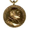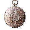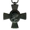 Längliches silbernes Kreuz. Die Kreuzarme mit erhöhtem polierten Rändern, geschwungen und an den Enden leicht nach innen gebogen. Die Innenseiten der Kreuzarme mit feiner Körnung. An den unteren 3 Kreuzarmen jeweils eine kleine Kugel. Durch die Mitte gehen 2 gekreuzte silberne Schwerter. Am oberen Kreuzarm angelötet eine Öse mit Bandring. Mittig ein mitgeprägtes, ovales Medaillon.
