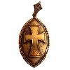 Silbernes Kreuz mit erhöhten, glatten und vergoldeten Rändern. Die Innenseiten der Kreuzarme sind fein gekörnt. Vorder- und Rückseite mit aufgelegtem, emailliertem, runden Medaillon. Am oberen Kreuzarm eine goldene, verzierte Agraffe mit runder paralleler Öse. In diese eingehängt ein Bandring mit star angebrachtem kleinen Ring, beides aus Gold.