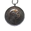 Silberne Medaille mit Rand. Vorder- und Rückseite mit umlaufender Perlenschnur am Rand. Oben eine angelötete, gewöhnliche Öse mit Bandring.