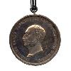 Runde Medaille aus Silber mit erhöhtem Rand. Oben eine parallel stehende Öse mit kleinem Steg an der Medaille befestigt. Durch die Öse geht ein kleiner Ring mit Bandring. (Abb. zeigt eine Bronze versilberte Medaille)