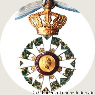 Achtarmiges, goldenes Kreuz aus 4 langen und 4 kürzeren Kreuzarmen. Die Kreuzarme sind weiß emailliert. An den Enden der Kreuzarme jeweils 2 Spitzen (ähnlich Johanniterkreuz). Vorder-und Rückseite mit aufgesetztem, runden, goldenem und emailliertem Medaillon. Zwischen den Kreuzarmen ein spitz zulaufender Strahlenkranz. Am äußeren Rand der Kreuzarme umlaufend ein lichter, goldener Eichenlaubkranz, die Blätter grün emailliert. Unten gebunden mit einer goldenen Schleife. Die Kreuzarme überlagern den Kranz auf Vorder und Rückseite. Zwischen den Spitzen des oberen Kreuzarmes eine Agraffe an der die goldene Krone befestigt ist. Durch den Reichsapfel der Krone geht der Bandring.