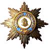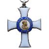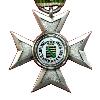 Achtspitziges silbernes Kreuz. Vorder-und Rückseite mit aufgelegtem runden Medaillon. Die Kreuzarme weiß emailliert und silber gerändert. Durch die Mitte 2 vergoldete Schwerter. Die Rückseite der Schwerter glatt. In der Mitte des oberen Kreuzarmes eine eckige Agraffe mit kleinem Ring und Bandring.