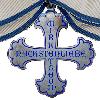 Längliches Steckkreuz aus vergoldetem Silber. Die Kreuzarme mit breitem goldenen Rand sind blau emailliert. Mittig ein aufgelegtes ovales Medaillon. Die Rückseite ohne Emaille mit senkrechter Anstecknadel mit Gegenhaken. Mittig eine runde Abdeckplatte mit Herstellerbezeichnung. Auf dem unteren Kreuzarm die Punze – S – für Silber.