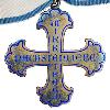 Silbernes Kreuz mit erhöhten, glatten Rändern. Die Innenseiten der Kreuzarme sind fein gekörnt. Vorder- und Rückseite mit aufgelegtem Mittelschild. Am oberen Kreuzarm eine beweglich, mit Innenscharnier verbundene, 5-büglige Krone. Durch den Reichsapfel der Krone geht der Bandring.