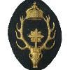 Stehendes ovales Abzeichen aus vergoldetem Messing. Die Mitte des Abzeichens ist durchbrochen gefertigt. Auf der Rückseite 6 angelötete Splinte zur Befestigung, die durch eine Gegenplatte gesteckt werden. Aufgebracht ist das Abzeichen auf Uniformstoff.
